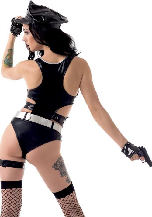 черное боди на молнии, белый ремень, чулки черная сетка, подвязка, пистолет, р-р 44-46