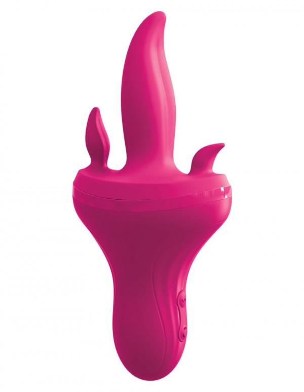 Вибратор представляет собой 3 язычка, 2 из которых предназначены для стимуляции клитора и ануса, а центральный для ласк лона и стимуляции G-точки! Вагинальный язычок обладает мощной вибрацией, а мини язычки вращаются в различных направлениях!